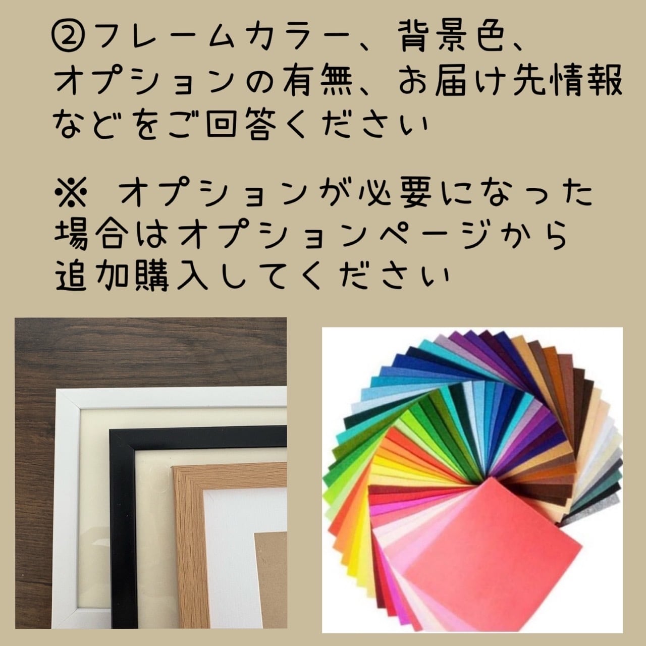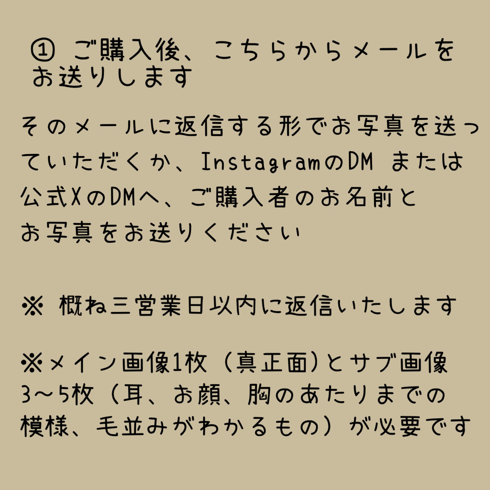 購入後、登録ただいているアドレスへメールいたしますので、お手数ですがそのメールへ返信する形で必要なお写真を送っていただくか、